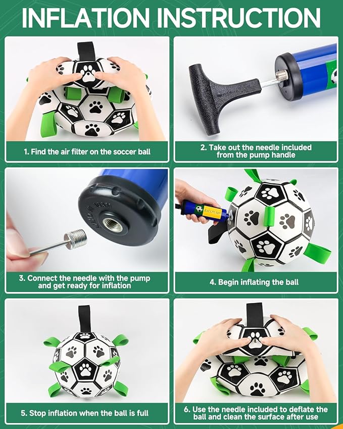• PUMP and Needle Adapter Included: The herding balls for dogs comes deflated. There's a needle point adapter and a pump inside as well while other items in the same market only include a ball needle. The large soccer ball dog toy is 10 inches in diameter, perfect for giant and large breeds, not for aggressive chewers
