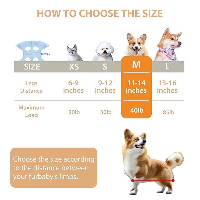 • This M size dog restraint for nail clipping is suitable for medium dogs that front and rear leg distance is between 11~14in, weighing under 45lb. Please check your pets' body size data and make a reference of the size form in main picture before purchase.