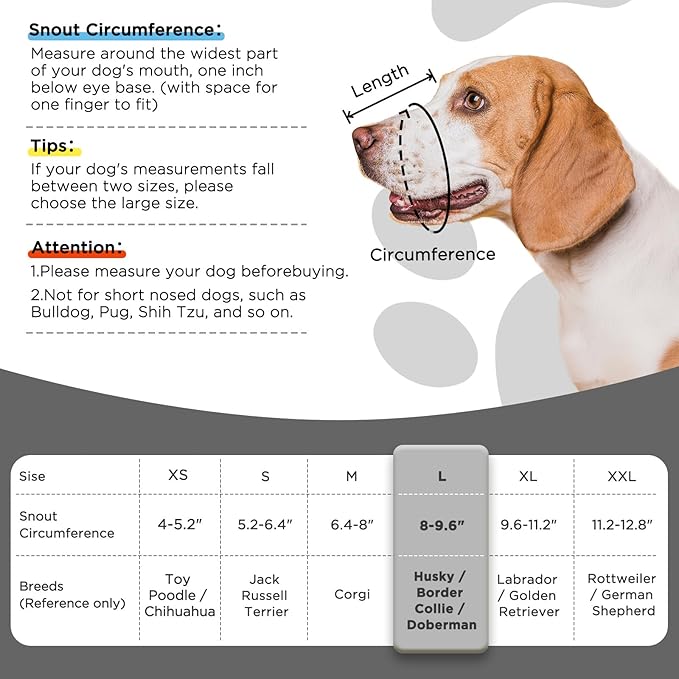 • Safety &Adjustable Dog Muzzle: Adjustable at snout and overhead strap. Keep the dog mask muzzle stays in place. Dont worry about your dog wriggling out of their dog mouth cover!.The reflective edges is safety for walking in dark.Please don't let your dog wear the muzzle for a long time without your supervision.