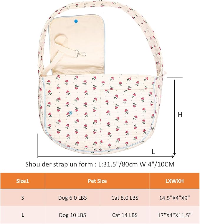 - Versatile Dog Sling Bag : The pet carrier sling that can be used for dogs, cats, and puppies, allowing we to comfortably and skin-friendly carry our small furry friend who like or need to be carried. The flower print dog sling can take your pet to the mall, the grocery store, the park, as well as daily walks and weekend adventure.