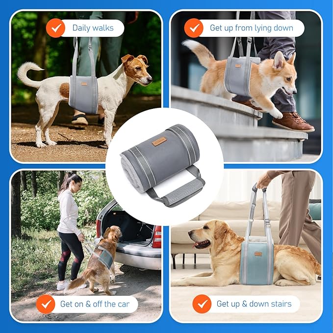 • SUPPORT HIP SLING - Our Dog Lift Harness is a reliable and effective solution for elderly dogs, orthopedic injuries, or any other debilitating ailments. Help your beloved pet regain mobility and independence with our innovative dog sling