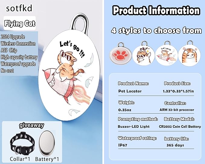• 【Built-in Speaker】Our cat tracker helps you find things nearby by playing sounds to indicate location. The cat tracker weighs only 10 grams and the included tracker collar is durable and drop-proof. The cat tracker battery has a standby time of up to 12 months and is easy to replace for long term use.