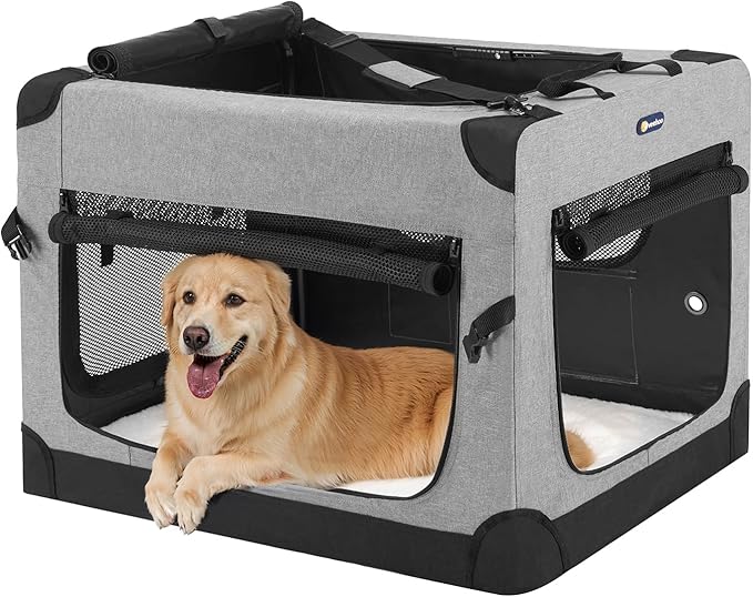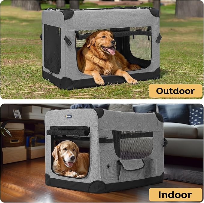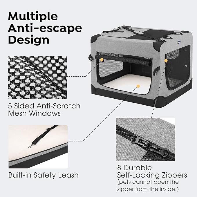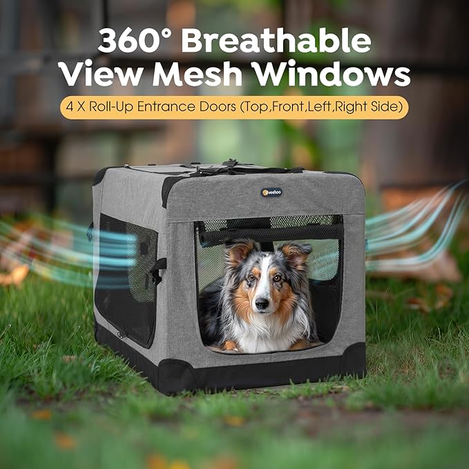 • 360° Breathable Vision Mesh Windows - 5-sided mesh windows of portable dog crate are highly ventilated, and 4 roll-up entrance doors (top,front,left,right side) allow your dog to enter and exit freely, as well visibility for anxious pets and owners.