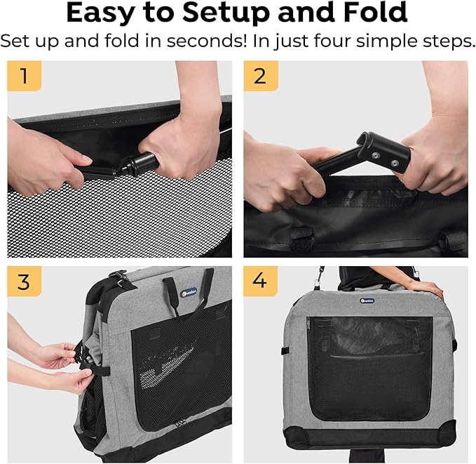 • Stable and Foldable Structure - This soft dog crates is made of all-metal frame structure, strong and stable. Collapsible steel frame with retractable springs makes setup simple (no tools needed) and fold flat for easy transport and compact storage. Easy carry with handle or strap. Adjustable strap included.