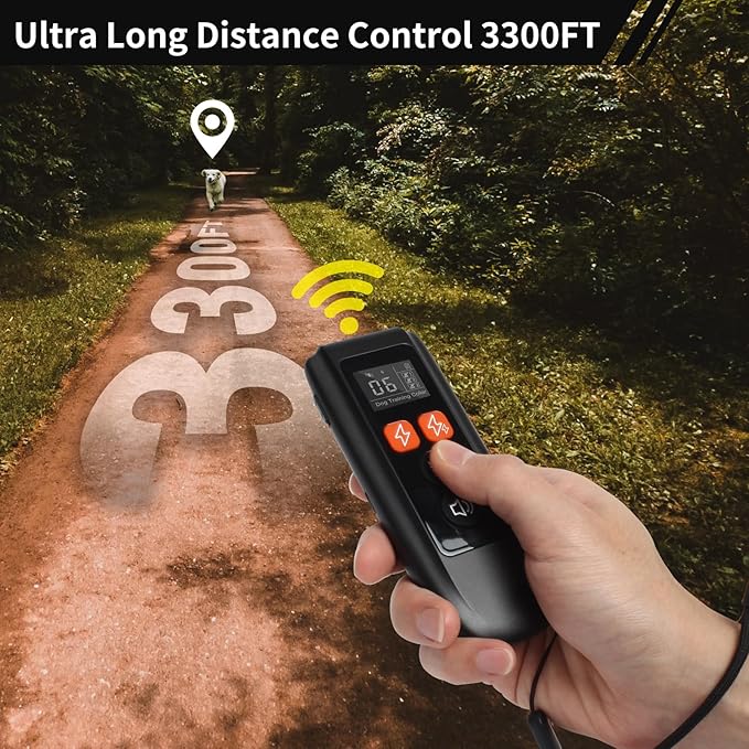 • 【Impressive Remote Range】The e collar for dogs training has a remote control distance of up to 3300 feet, you can train your dog even at a distance. The powerful remote of ecollars for dog training ensures you have full control, whether you're in the backyard, park, or during off-leash adventures.