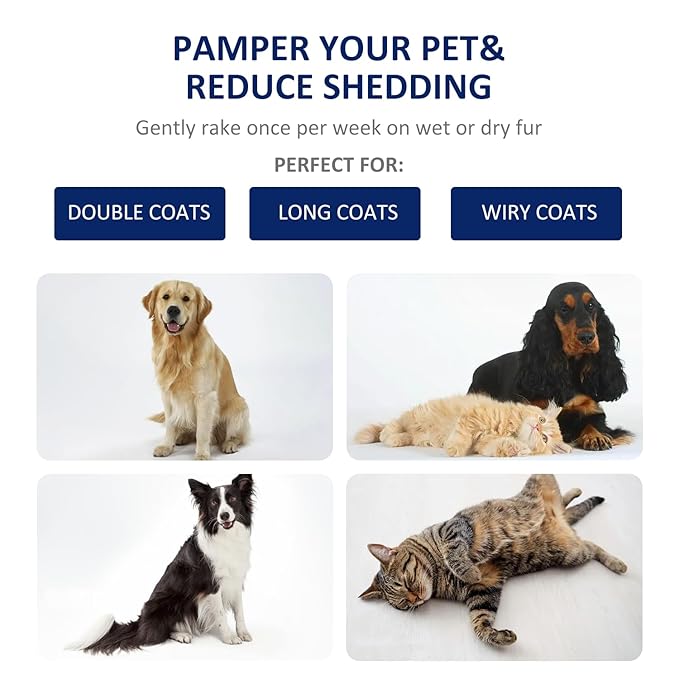 • [COMFORTABLE TO USE]: Keep your pet's coat clean and healthy with our undercoat rake for dogs. This grooming rake for dogs is designed with a lightweight, comfortable, non-slip rubber handle to keep the brush from moving around as you groom your pet.
