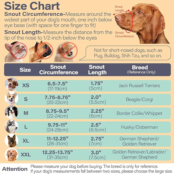 - Size L (Cir: 9.75-11”, length: 2.5–3.25”) – This muzzle for large sized dog fits Husky, German Shepherds, Malinois, etc., but not for aggressive dogs, highly anxious dogs. Measure your dog's snout circumference and length per the size chart or video. If between sizes, SIZE UP! For dogs with longer snouts like Dobermans, choose based on both snout circumference and length. Ensure the muzzle fits comfortably, with the nose not touching the edge