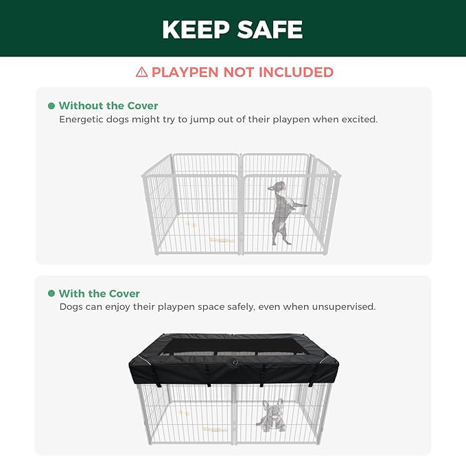 • Tightly Secured: Born from the thoughtful insights of FXW members who sought an extra measure of security, this dog playpen cover aims to address the concern of preventing dogs from jumping out or escaping. Designed to seamlessly integrate with our FXW Heavy-Duty Dog Playpen, this pen cover boasts a fully enclosed structure, reinforced fabric, and 16 hooks & loops for security. It ensures your dog stays safely within their play area.