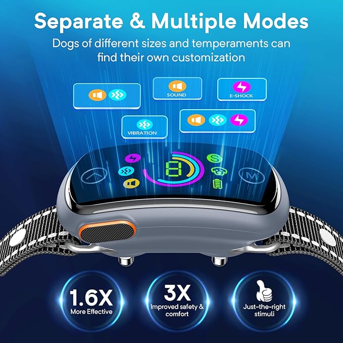 • Reliable and Safe Bark Control Solution: Our bark collar for large dog offers unparalleled flexibility with three user-selected modes: beep (0-3 level), vibration (0-7 level), and shock (0-7 level). Customize the intensity to meet your dog’s unique needs, ensuring a secure and effective way to stop barking with just-the-right stimuli. With a 1.6X improvement in correction efficiency and 3X enhanced comfort, experience a quieter and happier environment for you and your pet