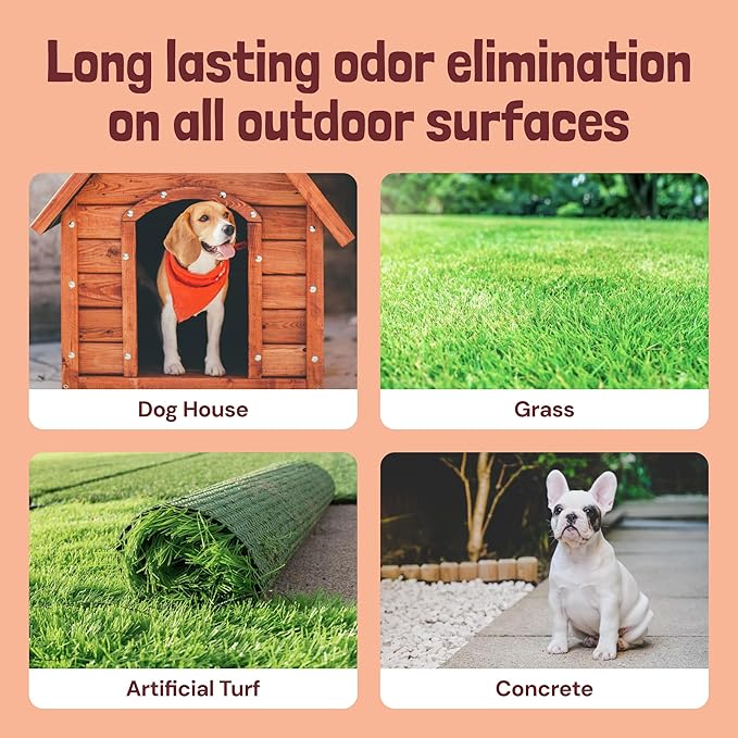 • For All Outdoor Surfaces: Use our turf odor eliminator for dogs, as a real or fake grass cleaner, or even to refresh the dog house. This powerful outdoor odor eliminator for dogs is a one-stop-shop for keeping all outdoor surfaces clean & fresh