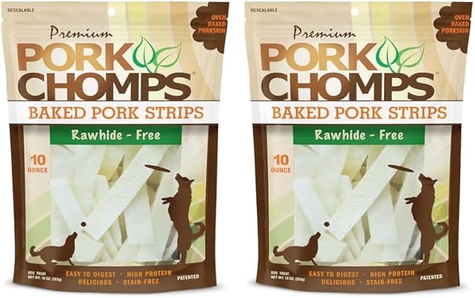 Pork Chomps Baked Pork Skin Dog Chews, 4-inch Strips, 10oz Bag (Pack of 2)