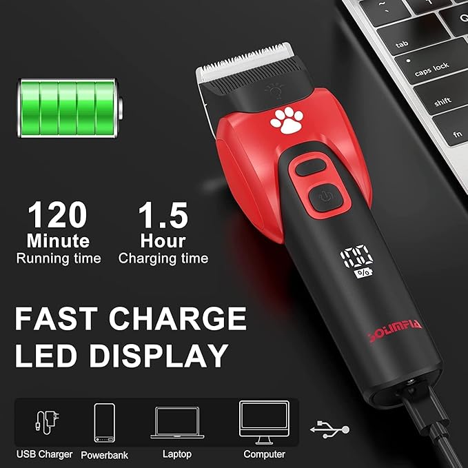 • Fast Charging: The dog and cat grooming kit is designed with a rechargeable battery support 120 minutes working time after 1.5 hours full charge.Cordless design, you can move freely while shearing the dog