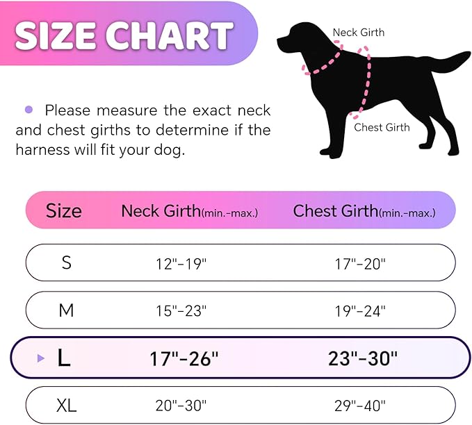 - Easy to Use, Fully Adjustable: The dog harness with simple design and quick snap buckles which make it easy to put on and take off. This harness features 7 easy size adjustors at neck and chest for easy adjusting to fit your dog perfectly, even with some room of growth.