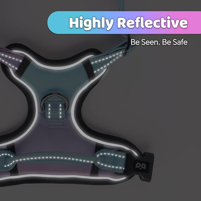 - No Pull, No Choke: Our non-pulling dog harness is specially designed with 9 metal leash rings for safer dog walks. Use the chest attachment clip to stop your dog from pulling on walks, perfect for dog training or dogs who tend to pull. The back clip is great for daily walking, jogging, hiking, etc. Sturdy Top Handle for better control the sudden and dangerous movements of your dog to ensure security.
