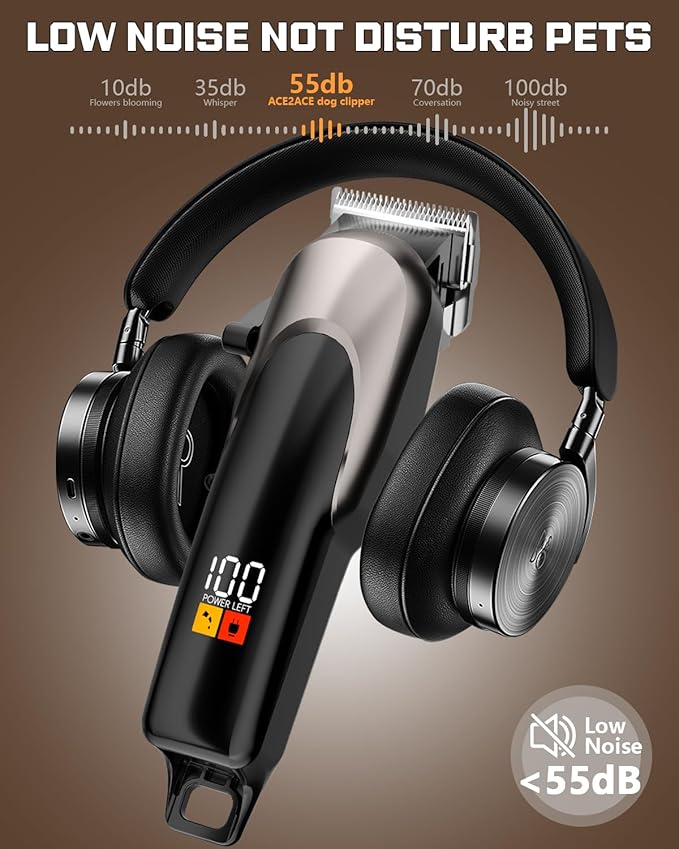 • Low Noise, Similar to normal indoor conversation: The running sound of our Professinal dog grooming clliper is lower than 55db, which similar to normal indoor conversation that don't scared your dog or cat to ensure continuous grooming
