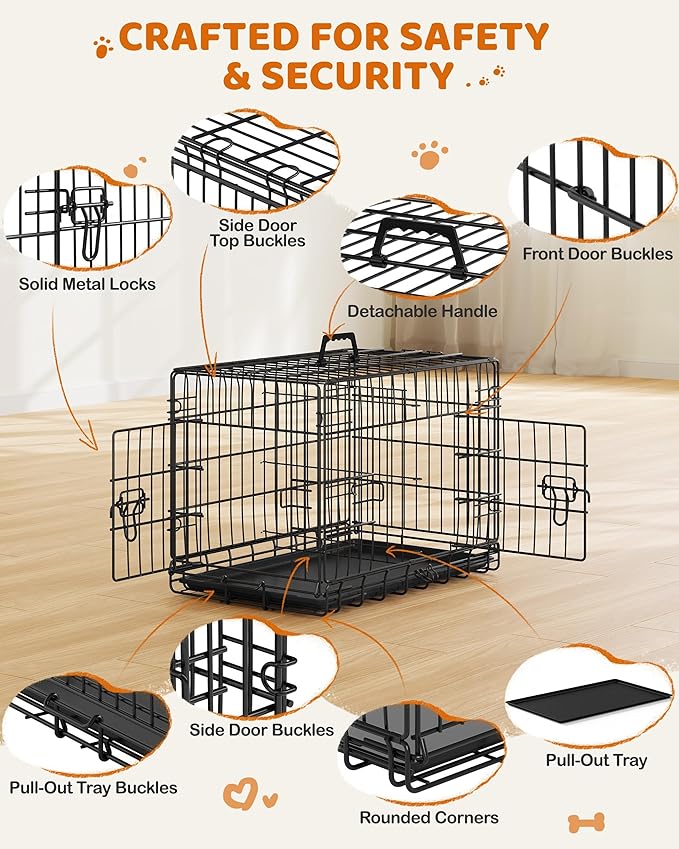 • Optimal Bar Spacing and Easy Maintenance: This metal wire dog crate boasts an ideal bar spacing of 1.3″, ensuring both security and visibility to the external environment. It helps reduce separation anxiety by maintaining a connection to their surroundings. In addition, it features a pull-out leak-proof tray with locking buckles, making maintenance a breeze