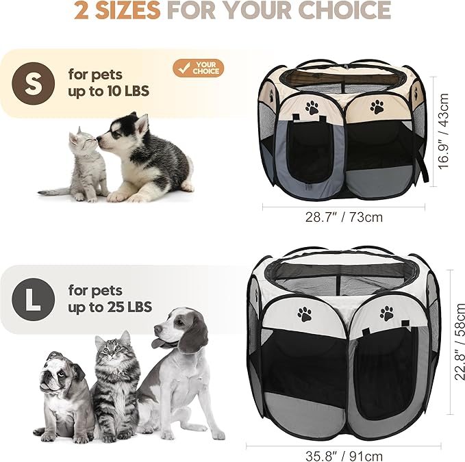 • Perfect Size: Our playpen is available in two sizes, S: 29*29*17, L:36*36*23, which is suitable for most pets, making it easy to keep them safe and secure both indoors and outdoors.