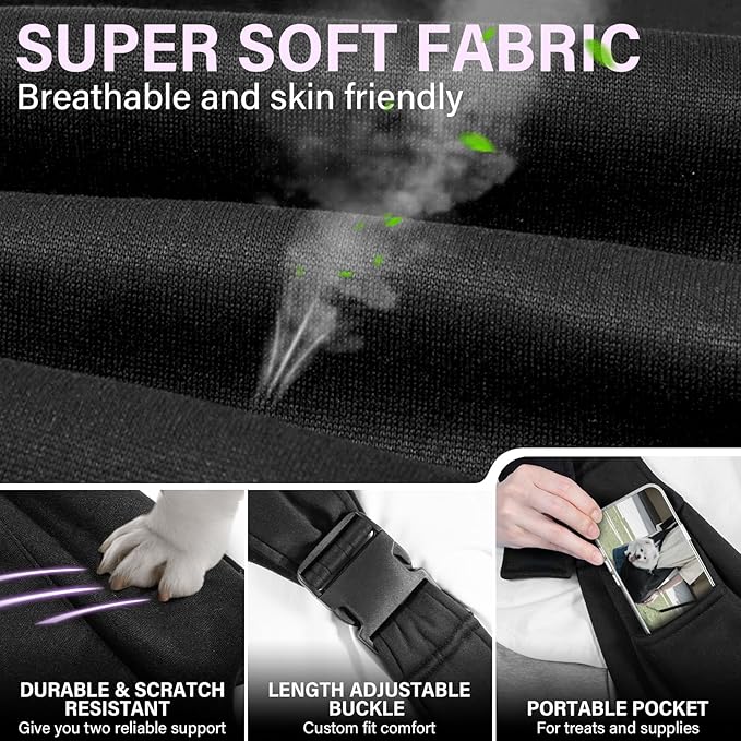 • COMFORTABLE CARRY: The puppy sling carrier bag’s large opening make it easy for dogs to go in and out, which is very convenient for us to use. It includes a handy pocket on the shoulder strap for essentials like phones, keys, cards, or wallets. The sandwich mesh and padded shoulder straps offer breathable support
