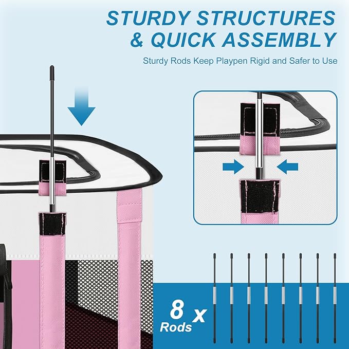 • 【No Assembly required】Opening the dog pen takes only a few seconds, is lightweight, strong, and does not require assembly. When not in use, it can be folded into the tote bag provided by us, which takes up minimal space and is easy to carry and store. Spacious interior Spaces allow your pet to play, sleep, hide or isolate. Perfect for indoors, lawns, beaches, parks, Tours, camping and more!