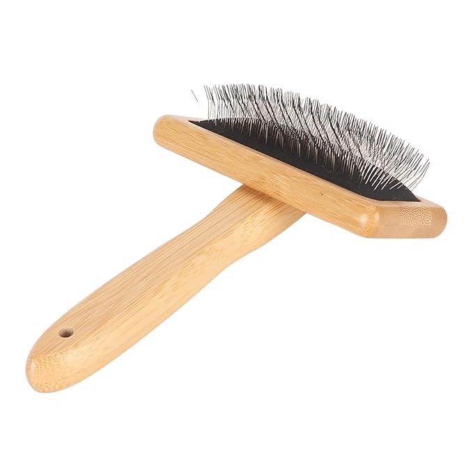 Macrame Slicker Comb with Hole Cushion Finely Polished Bamboo Cleaning Brush Sheepskin Wool Stainless Steel Pins Carding Rug Fur Brushes Long Prongs Pet (13.7x20.3x5.2cm