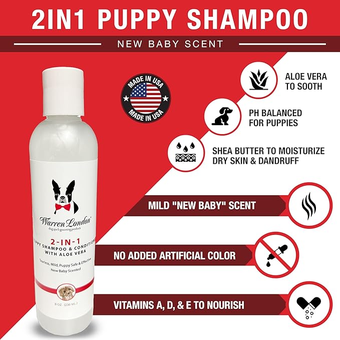 • 2-in-1 Puppy Shampoo & Conditioner with Aloe: Gently cleanse and condition your puppy's coat with our all-in-one formula enriched with aloe to leave fur soft, shiny, and tangle-free.