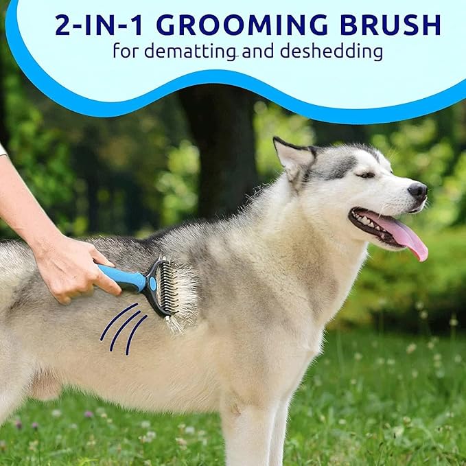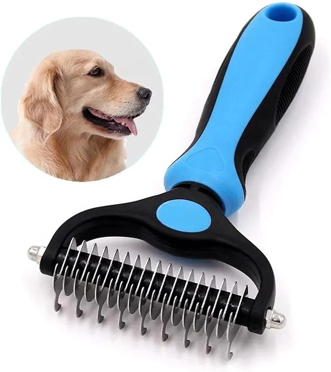 Pet Dog and Cat Deshedding Brush Grooming Tool Fur Removal - Double Sided Undercoat Rake Shedding Comb Mat Remover Deshedder Safe Detangler for Matted Hair/Fur, Blue