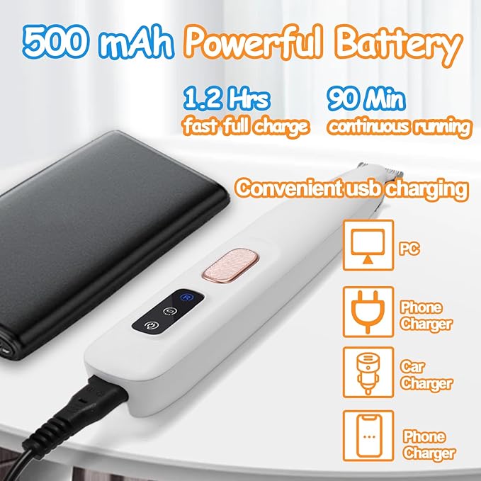 - Fast Charging, Long-lasting Battery Range: The dog paw trimmer incorporates fast charging technology, bidding farewell to lengthy wait times. Simultaneously, it boasts robust endurance, enabling a full charge to power up to 1.5 hours of continuous use, eliminating the need for frequent recharging. This satisfies the demands of multiple trimming sessions, whether for daily home use or in a professional pet grooming, making it an indispensable pet care assistant that easily handles any trimming.