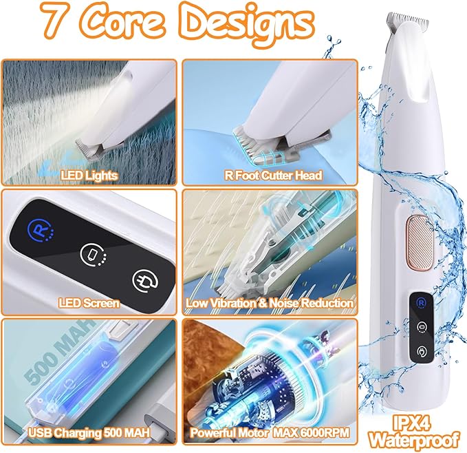 - High Efficiency Power, 6000RPM Strong Speed: The Pet Paw Trimmer is built with a high-performance motor capable of reaching speeds up to 6000RPM, making it easy to tackle various hair densities. Whether it's trimming your dog's paws, ears or other areas, this dog paw trimmer handles it with ease, achieving a fast and precise trimming effect. Moreover, the head of the dog trimmer employs an R-shape design, ensuring that it won't scratch your pet's skin during trimming and safeguarding your pet's safety