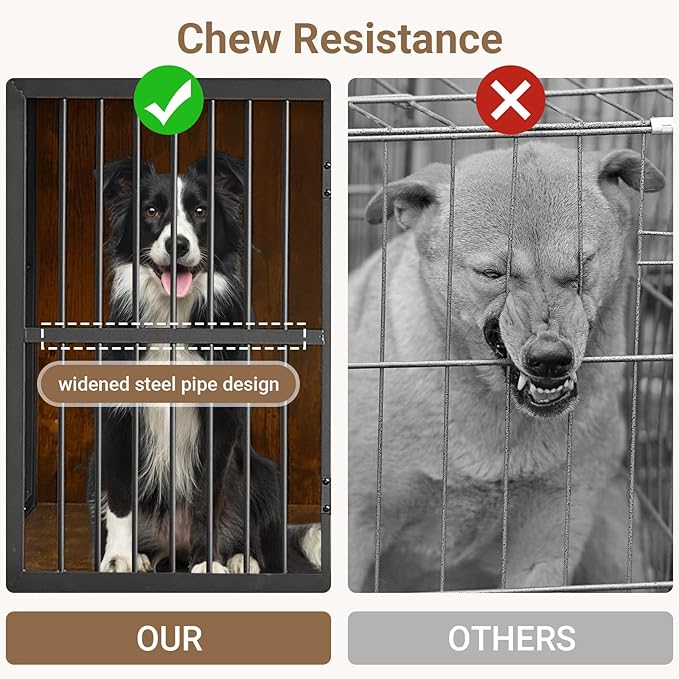 • Secure & Sturdy - Dog kennel indoor features MDF board, ensuring a healthier environment for your pets and family. The durable iron frame can support over 400 pounds on top, and the reinforced iron door frame is both stylish and chew-resistant, significantly extending the crate's lifespan.