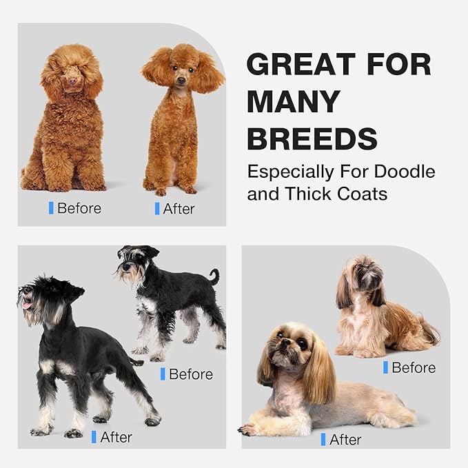 • 【Low Noise and Quiet Motor】The dog clippers for grooming is made of high-speed and quiet motor, noise when working is less than 55 db. It makes your pets no afraid of cutting hair any more. Our motor operating at 6800 RPM, optimized for thick coats, minimizing hair pulling, reducing shaving time by 45%!