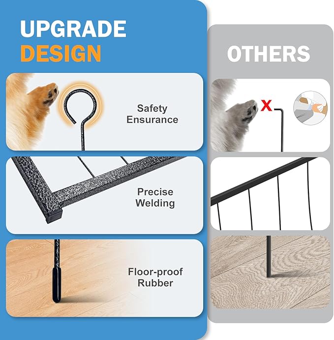 • Easy to Use: The panels come with individual poles to connect them together, easy to set up or take it down in minutes, dog fence can do multiple combinations and configurations, dog playpen for the yard easily conforms to different shapes according to your garden or room, circle, polygon, irregular, etc.
