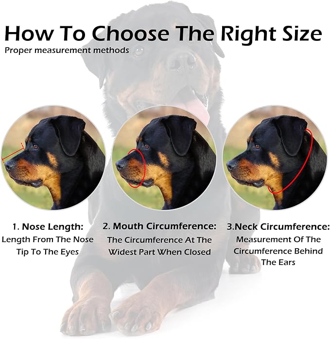 • Rottweiler Muzzle Size: The dog’s snout girth is 13 1/2 inches, and the length is 3 1/2 inches. Please measure both to ensure a proper fit before purchasing.