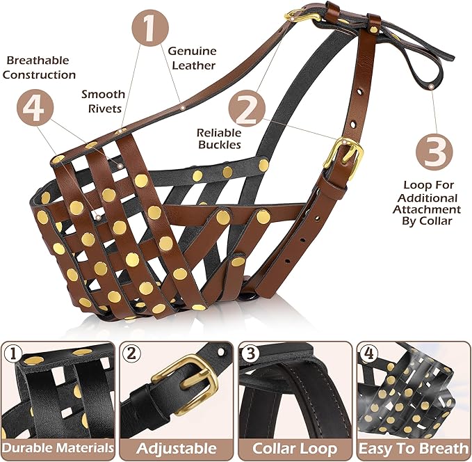• Materials: Crafted from premium genuine leather with stainless-steel rivets, our cage muzzle ensures safety and durability for large dogs. The adjustable leather straps provide a secure, comfortable fit, preventing slipping during use.