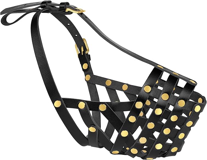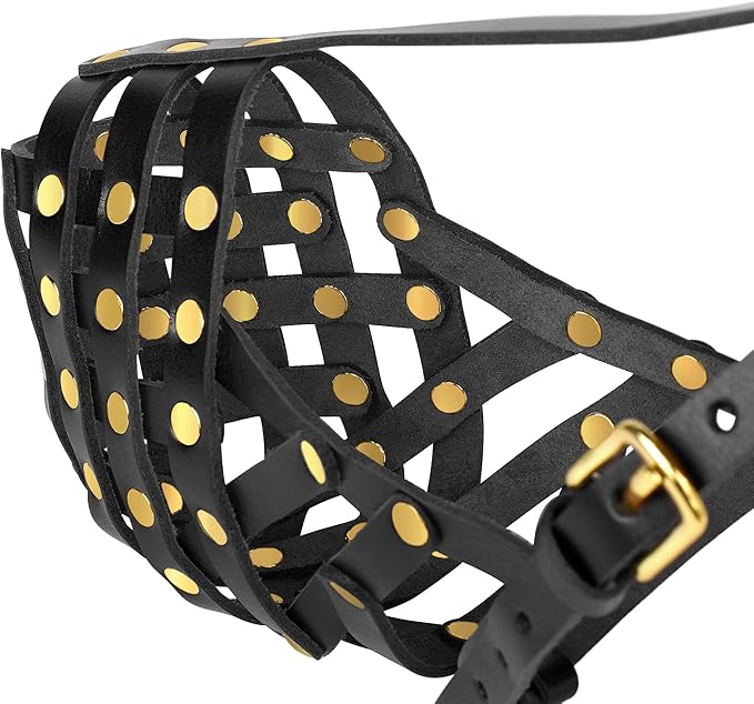 • Materials: Crafted from premium genuine leather with stainless-steel rivets, our cage muzzle ensures safety and durability for large dogs. The adjustable leather straps provide a secure, comfortable fit, preventing slipping during use.