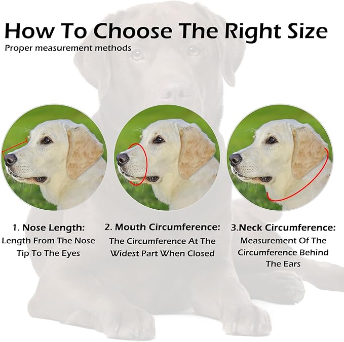 • Labrador Muzzle Size: The dog’s snout girth is 13 3/4 inches, and the length is 4 inches. Please measure both to ensure a proper fit before purchasing.