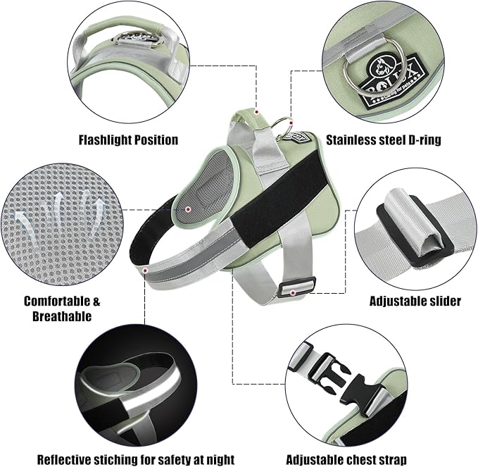 • OUTDOOR HEALTHY: Puppy no pull dog harness with reflective straps to ensure your dog is highly visible and keep dogs safe at night. You can connect the dog leash on the D-ring and with handle is easy to control on crowded streets. The high-end pet harness is perfect for daily walking, running, hiking, training, hunting, outdoor adventure and more!