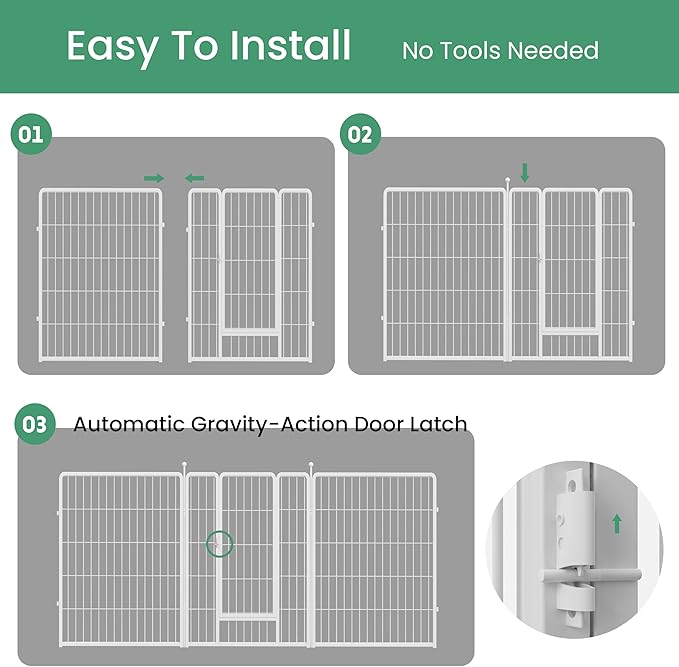 • 【Safe & Free Space】Offering enough space for your pets to play and exercise. The automatic gravity-lock mechanism will reduce the chances of the pet unlocking it on its own. The stakes with round ball tips protect you and your animals from injury.