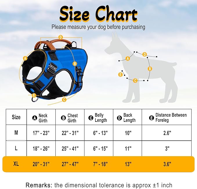 - [Dog Harness for Medium Large Dogs] - A professional tactical dog harness has 5 adjustment locations to allowing you to achieve a secure and comfortable fit for your dog's body shape. Neck Girth: 20”- 31” (51 - 79cm), Chest Girth: 27”- 47” (68 - 120cm), Back Length: 13”(33cm).Please refer to our size chart, make sure match up your dog's measurement