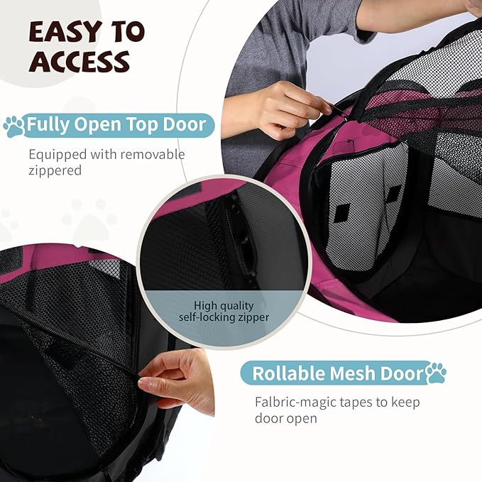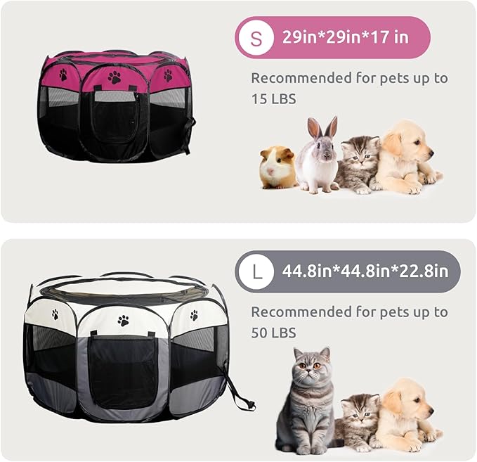 • 🐶Pop-up & Portable: Our pet tent can be rapidly unfold or fold without any assembly of metal parts. For easier carriage and storage, you can fold it up when unused. Quickly make a lounge for your tired pets after indoors/outdoors games. Besides small cats, small dogs, kittens and puppies, our cat playpen is also suitable for rabbits, ferrets and guinea pigs.