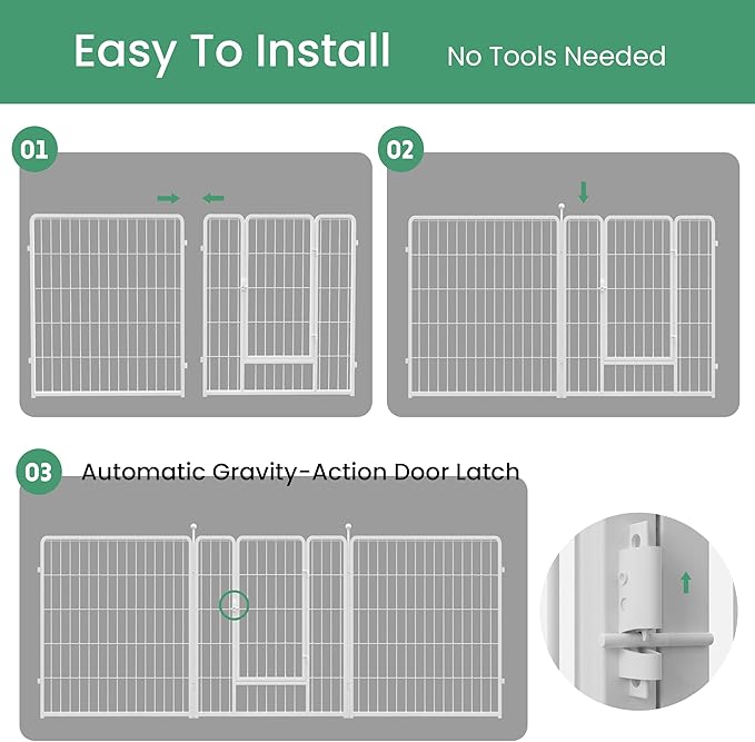 • 【Upgraded Dog Playpen】Dog playpen indoor adopts gravity door lock design, much safer and more convenient. Made of heavy-duty metal panels and stakes with black coating, non-toxic, anti-rust. Ensures long-time use no matter indoor or outdoor.