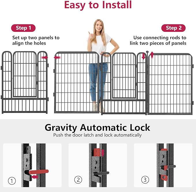 • 【Safe & Upgraded Design】: Jhsomdr outdoor dog kennel upgraded with automatic door lock is firm and prevents pets from escaping; Metal round-top rods are designed round ball top and elongated bottom, effectively protecting pet claws, and pounded into the ground for greater stability. The bottom of our pet fence is designed with anti-slip foot pads and flat stakes, also suitable for indoor use without scratching indoor floor