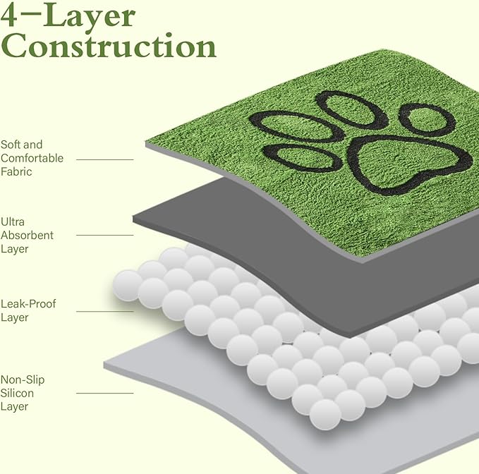 • Fresh and cute appearance: The mats feature an adorable paw print pattern and a fresh, attractive design that imitates real grass. Made from 100% polyester fabric, they combine the appealing look of artificial turf with the soft, comfortable texture of a long wool blanket. These pads are highly absorbent, reusable, and provide the perfect blend of functionality and style for your pet.