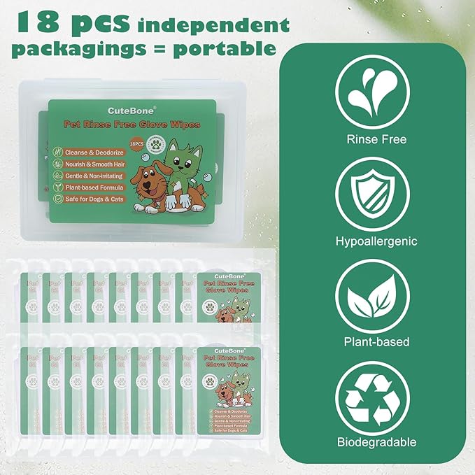 CuteBone Pet Glove Wipes - Dual-Sided Grooming Gloves with Wipes, Gentle and Effective Cleaning for Dogs, Removes Dirt, Fur, and Dander, Convenient and Mess-Free Grooming Solution, 18 Count