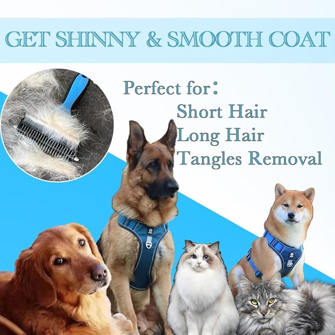 • 2-in-1 Dog Brush for All Hair Types This versatile grooming tool is designed for both cats and dogs, whether they have long or short hair. The dual-sided brush includes a shedding blade and a deshedding rake to tackle loose fur, tangles, and mats effortlessly.