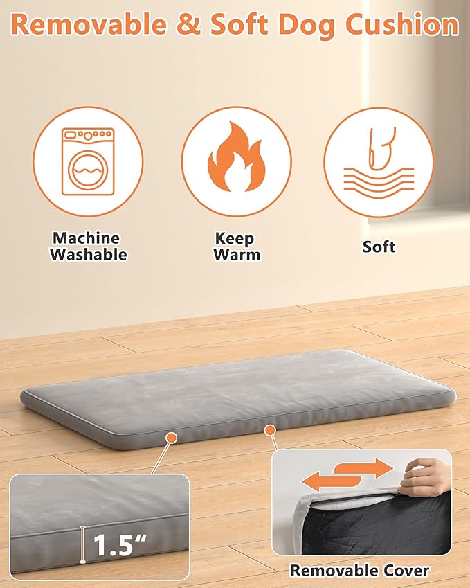 - 【Dog Crate with Cushion】 Imagine your furry child in this dog crate with a specially customized mat that is like a warm blanket for his cot for the cold nights. This mat is removable for machine washing and very easy to clean. The bottom of this dog crate is made of sturdy wooden boards, so you don't have to worry about your dog's little feet getting stuck in the crevices at all, so that your baby can sleep more peacefully.