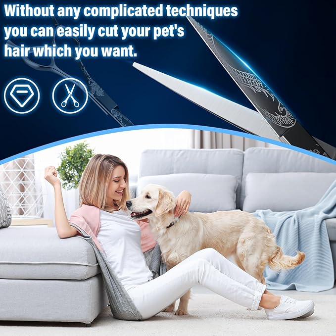 • Ergonomic Comfort: The pet grooming scissors feature an innovative ergonomic design that fits comfortably in your hand, allowing for prolonged use without discomfort. Experience enhanced precision while trimming your pet's hair to give them a stylish look.