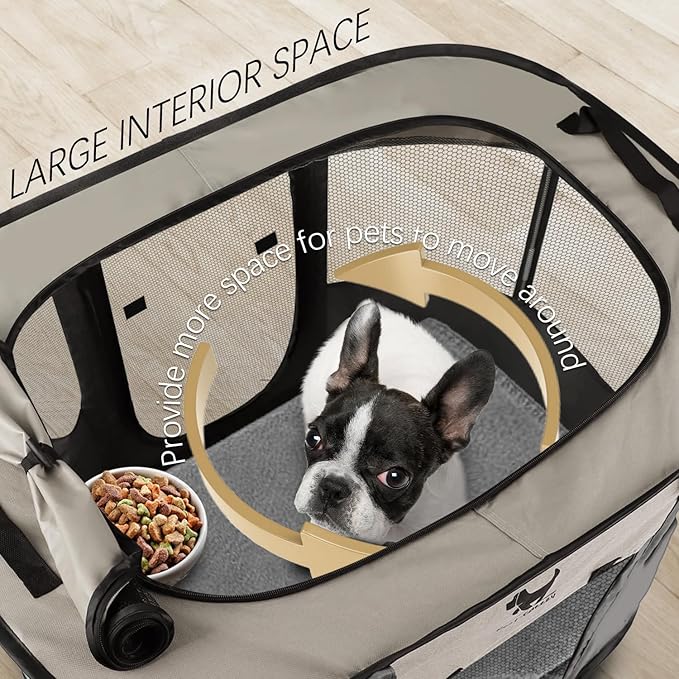 • Hassle-Free Cleaning: The collapsible dog crate material is waterproof, stains only need to be wiped off, the foldable dog playpen can also be washed with water and quickly dry. With a stain-resistant coating, cleanup takes 70% less time vs. traditional dog playpens. Easy to reach and clean if you have a blanket on the bottom.