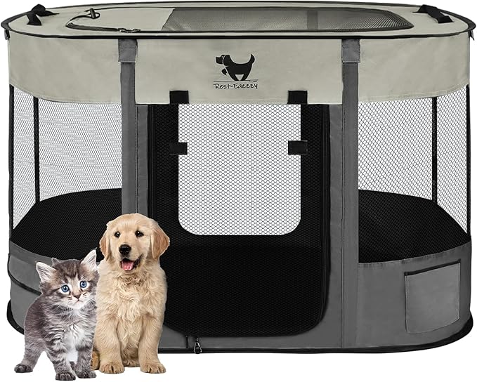 Rest-Eazzzy Dog Playpen, Foldable Kitten Playpen for Medium Dogs, Portable Pet Puppy Playpen with Removable Shade Cover, Indoor Outdoor Travel Camping Use for Small Pets with Carrying Case (S, Grey)