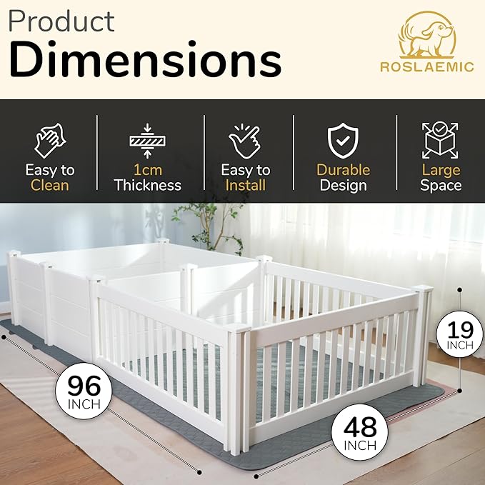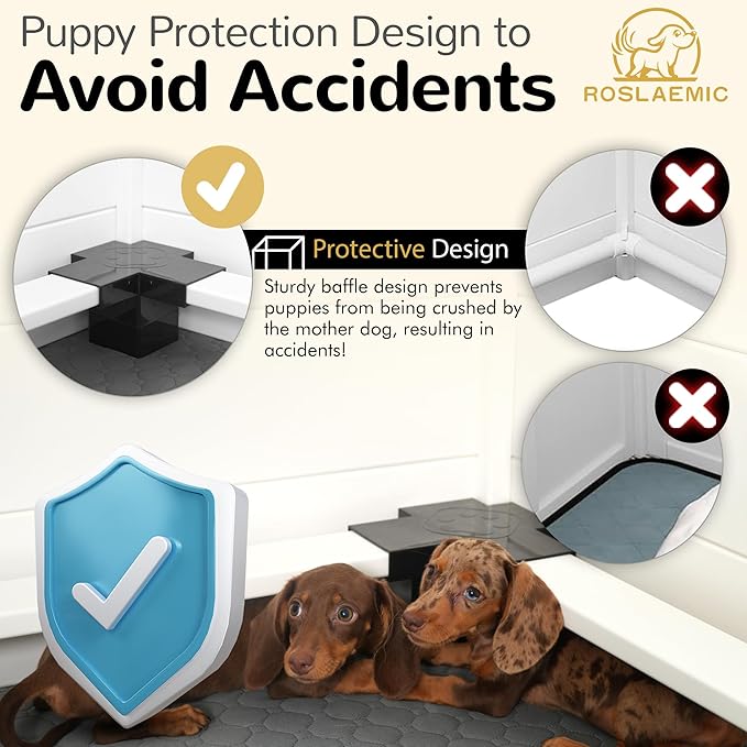 • Sturdy & Easy Install - Roslaemic welping box is made of Pet-friendly plastic. The 19-inch-tall dog whelping pen has internal dimensions of 96 x 40 inches. Installation takes only five minutes and no tools are required.