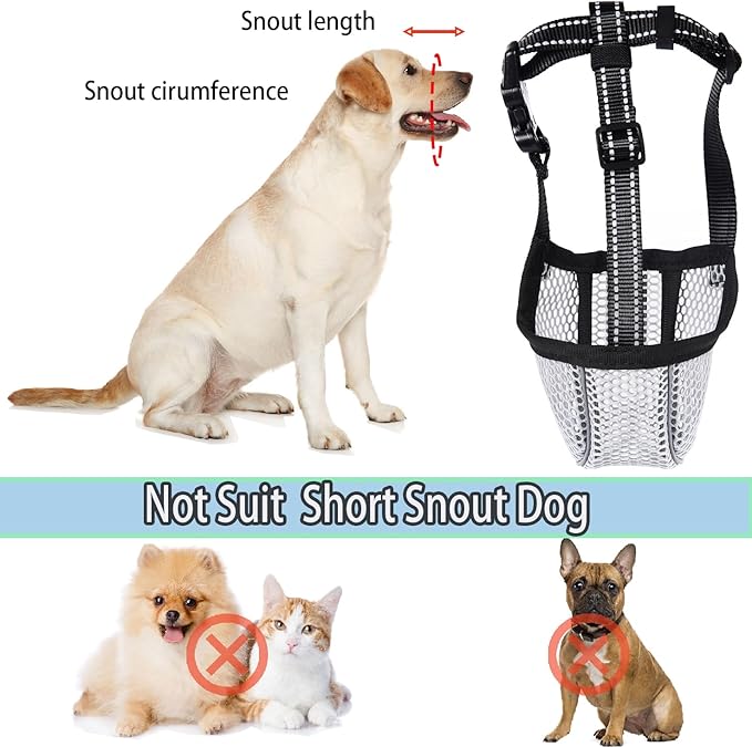 • [Measure and Size] Please measure your dog's nose circumference and nose length before purchase, the size we provide, fit for nose circumference 19-34cm, nose length 4-12cm, but not suitable for dogs with short nose, if you have any questions about the size, please email us, we will reply you within 24 hours.